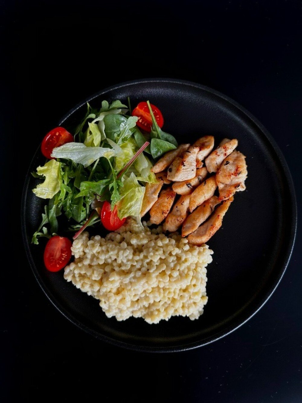 Состав: курица, птитим, сливочный соус, микс салата, черри, сыр, салатная заправка.