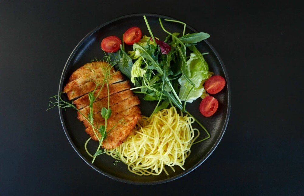 Состав: курица панко, микс салата, яичная лапша, черри, заправка салатная, соус.