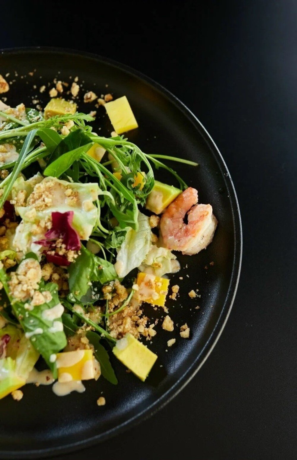 Состав: креветки, манго, авокадо, салат микс, соус, грецкий орех.