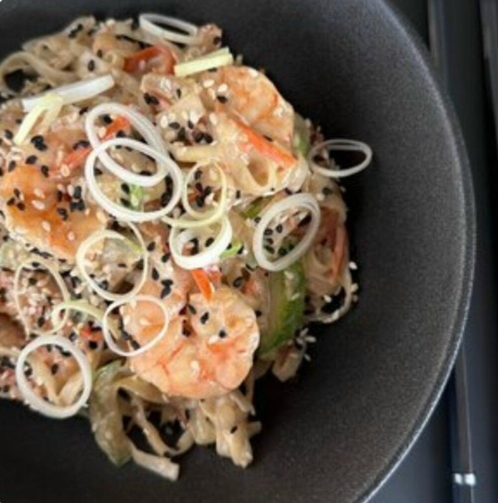 Состав: лапша соба, креветки, морковь, цукини, лук репчатый, кунжут, соевый соус, лук порей, сливочный фирменный соус.