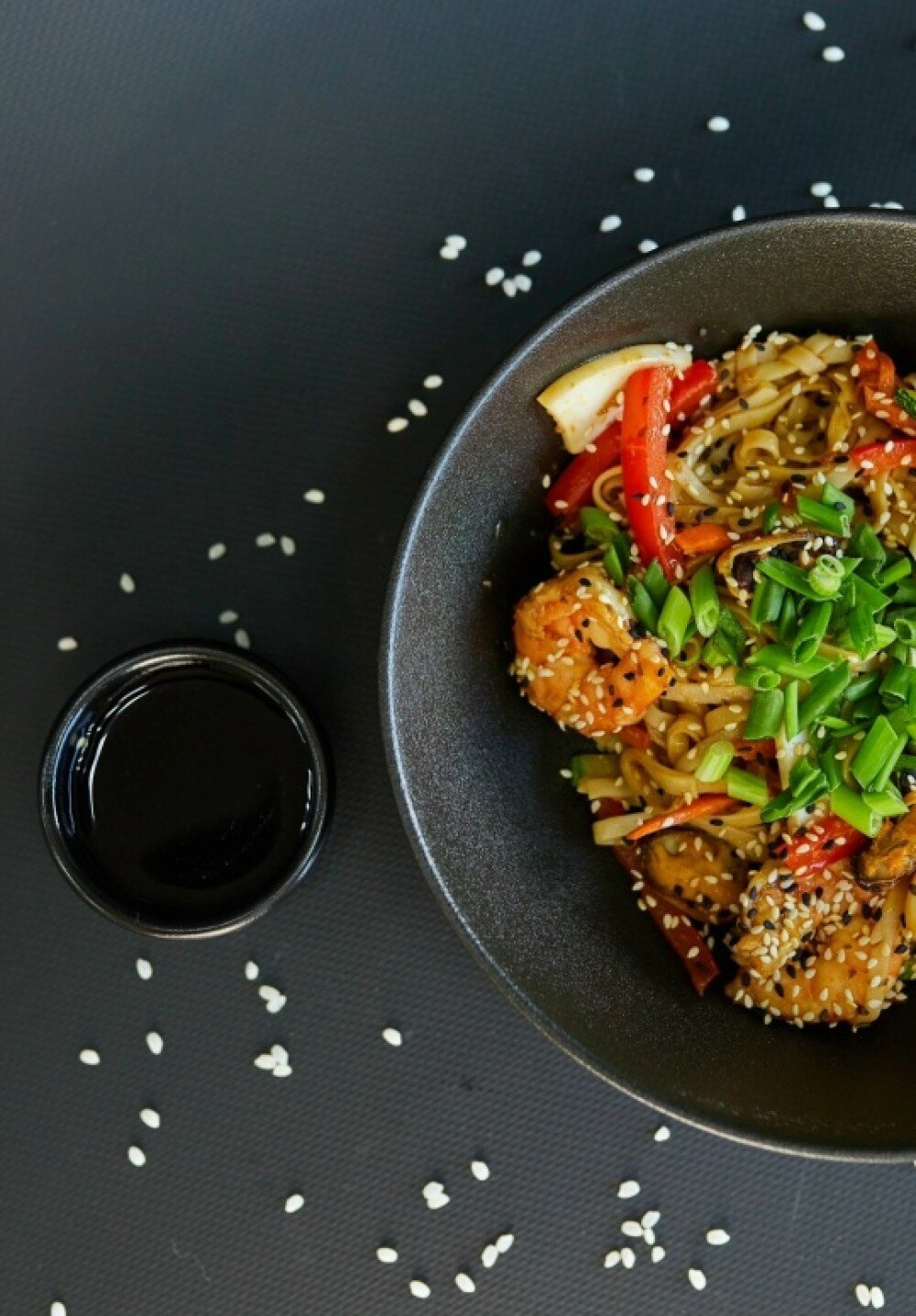Состав: лапша соба, коктейль из морепродуктов, морковь, цукини, болгарский перец, соевый соус, фирменный соус, лук зелёный, кунжут.