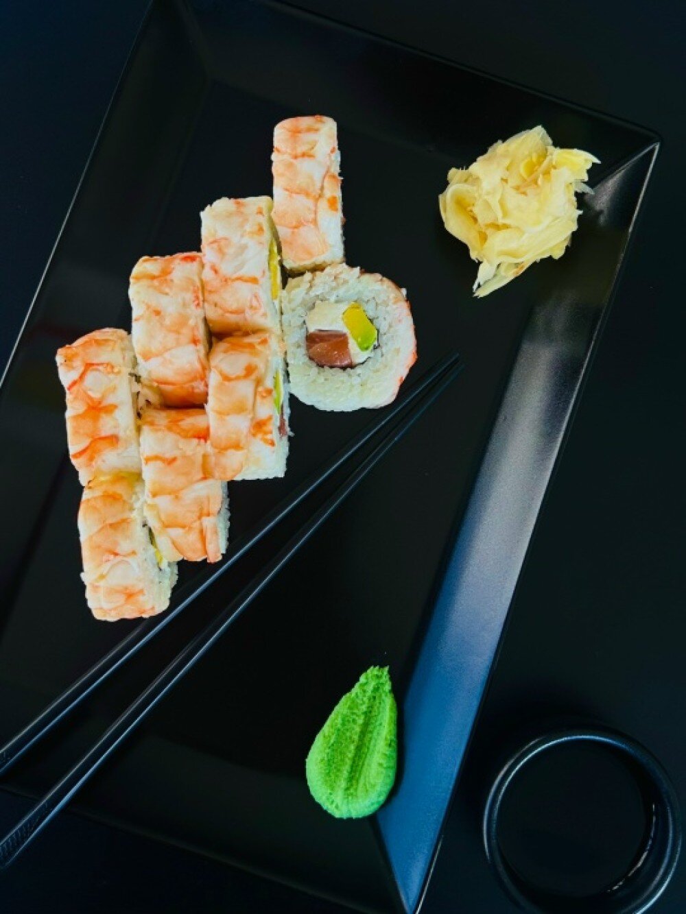 Лосось, креветки, авокадо, сыр, рис, нори.