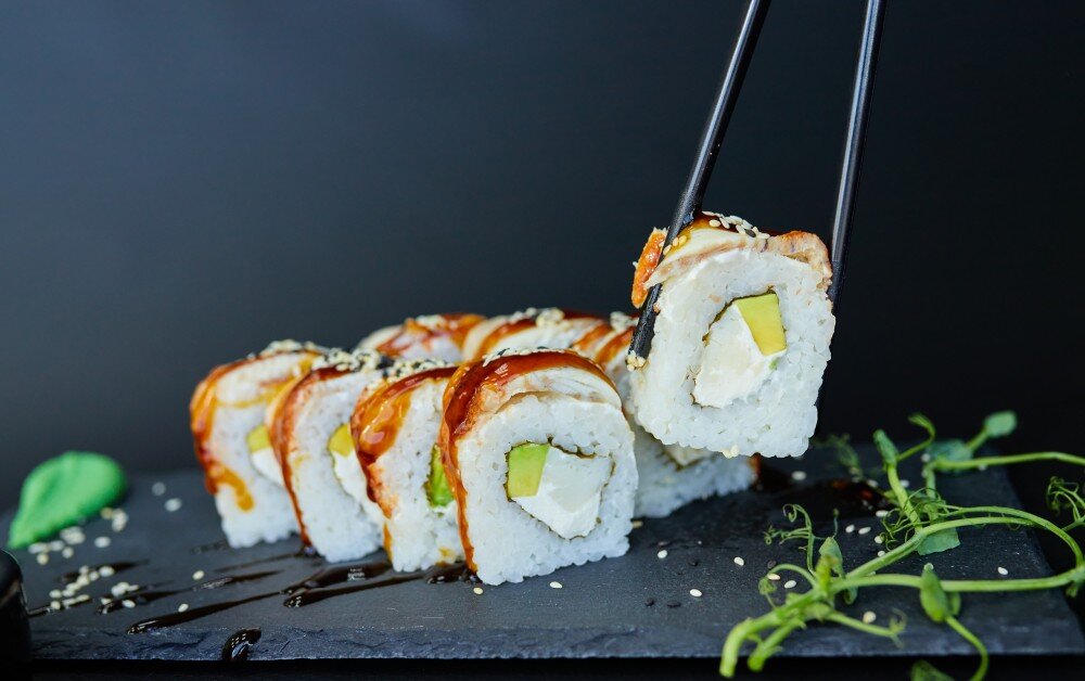 Угорь, маринованный дайкон, огурец, имитация краба, соус унаги, кунжут, сыр, рис, нори