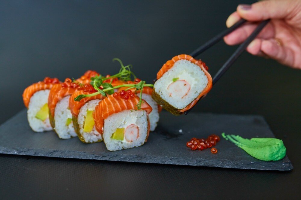 Состав: креветки, лосось, сыр, авокадо, икра, рис, нори.