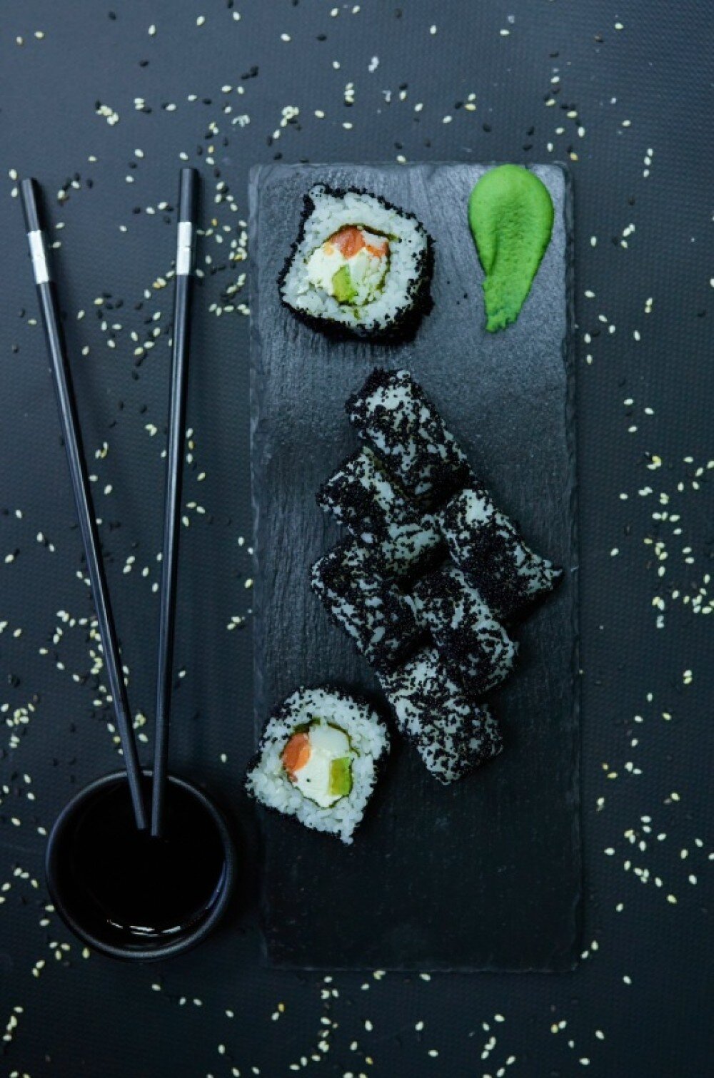 Авокадо, имитация краба, майонез, огурец, икра тобико, сыр, рис, нори.