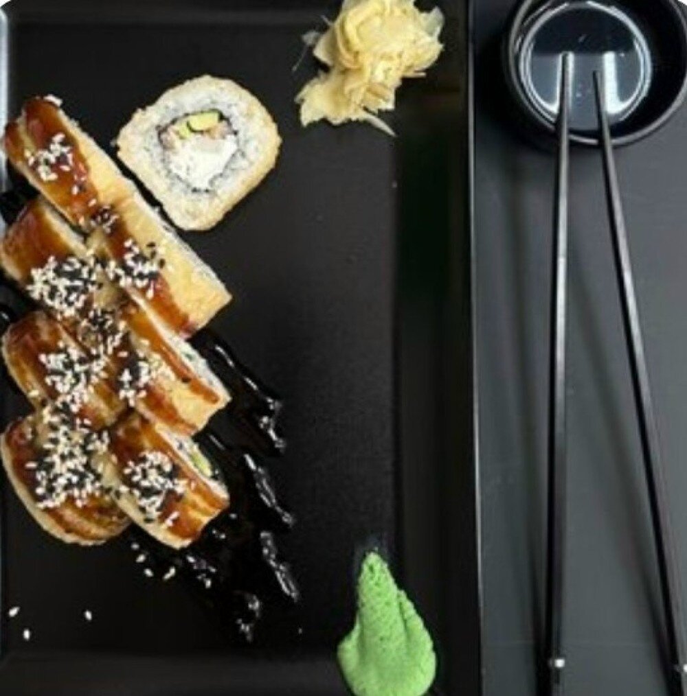 Угорь, имитация краба, авокадо, сыр, рис, нори, соус унаги, кунжут