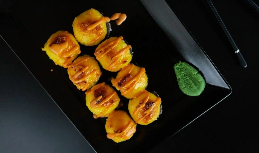 Курица, сыр, ананас, рис, нори, майонез, сыр гауда, соус спайс.