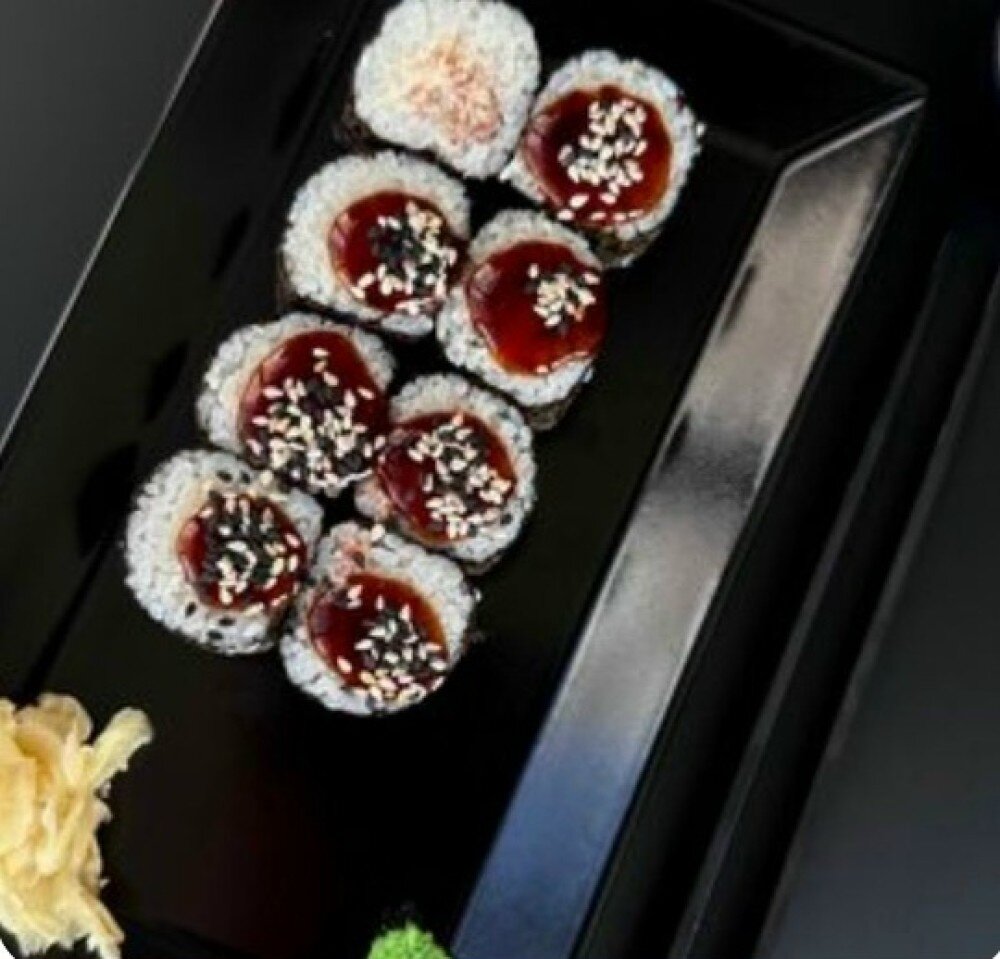 Угорь, рис, сыр, нори, соус унаги, кунжут.
