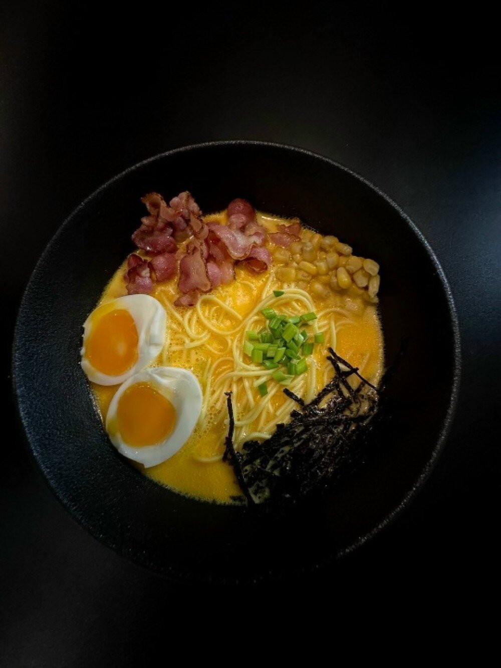 Бульон, яичная лапша, жаренный бекон, яйца, нори, кукуруза, лук зеленый